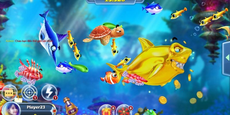• Bắt đầu trải nghiệm: Khi vào phòng chơi, bạn sẽ thấy giao diện game với các sinh vật biển đang bơi lội. Sử dụng súng để săn cá, mỗi viên đạn sẽ tiêu tốn một lượng xu nhất định, và bạn sẽ nhận được phần thưởng dựa trên giá trị của con cá bạn bắn trúng.